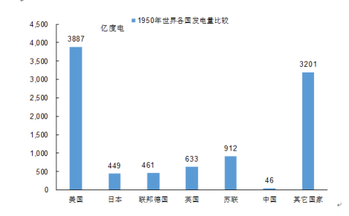 先把时间拨回70多年前,那时候的中国,是个什么光景?1949年,中国全年发电量才43亿度,还不到现在一个四线城市一年的用量。那时候,美国的发电量占了全球的30%-40%,我们连人家的零头都够不着。