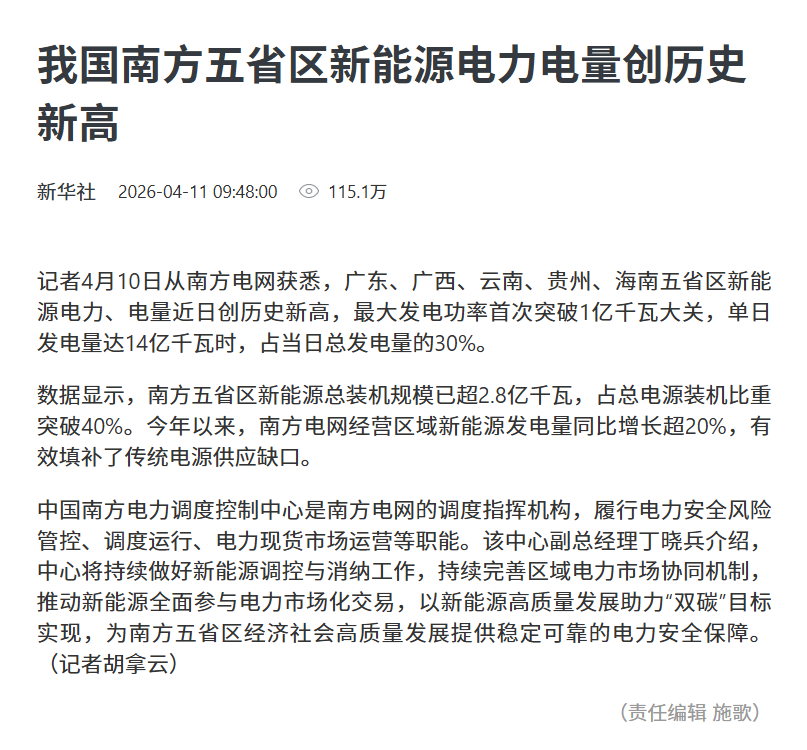 4月10日,中国南方电网传来捷报,南方五省区(广东、广西、云南、贵州、海南)的新能源,最大发电功率首次突破1亿千瓦,单日发电量高达14亿千瓦时,新能源发电量占当日总发电量的30%。