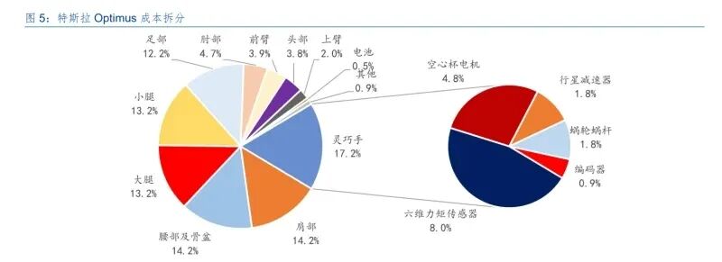 灵巧手约占整机成本 17%,成本层面灵巧手是整机最重要的部件之一。以特斯拉Optimus为例,从整机各部位的成本拆分来看,灵巧手成本占比约为 17.2%,占最大比重,其中空心杯电机、六维力传感器分别占比 4.8%/8.0%,行星减速器、蜗轮蜗杆、编码器分别占比1.8%/1.8%/0.9%,空心杯电机与六维力矩传感器是灵巧手中的核心部件。