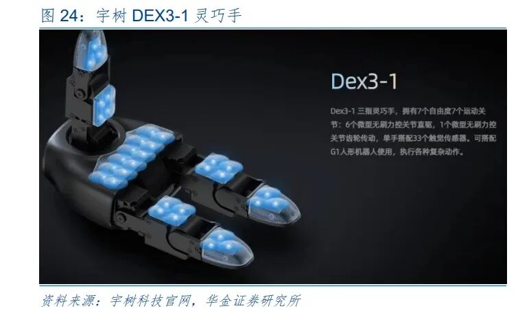 灵巧手持续迭代,更高自由度带来更大应用潜力。部分整机企业自研灵巧手,整体朝着更高自由度以及更强感知能力的方向去迭代,进而拓展灵巧手应用场景,如特斯拉Optimus的灵巧手自由度从 11 个迭代至 22 个,早期仅能完成较少的动作,但第三代灵巧手已经能够完成接网球等复杂动作。宇树科技的 DEX3-1 仅拥有 7 个自由度,而DEX5-1 已拥有20个自由度,应用潜力实现大幅提升。