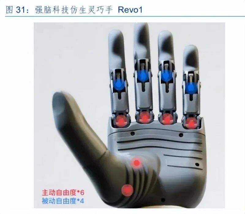 8) 强脑科技: 强脑科技拥有两款仿生灵巧手产品 Revo1 和 Revo2,其中Revo1 单手承载高达30KG,单手主动握力 6KG。Revo 1 触觉版灵巧手实现仿人三维曲面造型和触觉布局,通过指尖触觉感知多维度信息,如压力、摩擦力、受力方向、接近距离、表面材质等。每个手指有三个触觉感应点,每个感应点能感应三维力和接近觉,实现 11 个通道的多维触觉感知数据实时采集,最小识别力≤1g,精度可达到 0.01N,线性度高,同时采样频率大于 50HZ,实时反馈更快,精准度更高。Revo2 是基于假肢手与 Revo 1 灵巧手的成熟技术迭代升级,内置6 个电机,具备6个主动关节, 共有 11 个自由度。单手重量 383g,尺寸 160mm,主动握力50N,单手负载20kg,极致负载同时做到轻量小巧,外观仿生美观。Revo 2 灵巧手可配备多维触觉感知能力,具备自定义手势,多重保护,伺服控制算法,触觉自适应抓握,OTA 在线升级等等,助力快速实现灵巧场景落地。