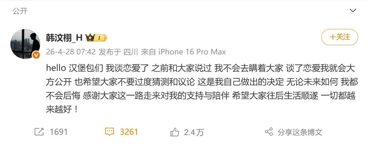 4月28日一大早在线炒股配资识,网红韩汶栩的一条微博直接把热搜预定。他在个人账号“韩汶栩_H”上扔下一枚重磅炸弹:“hello 汉堡包们,我谈恋爱了。”